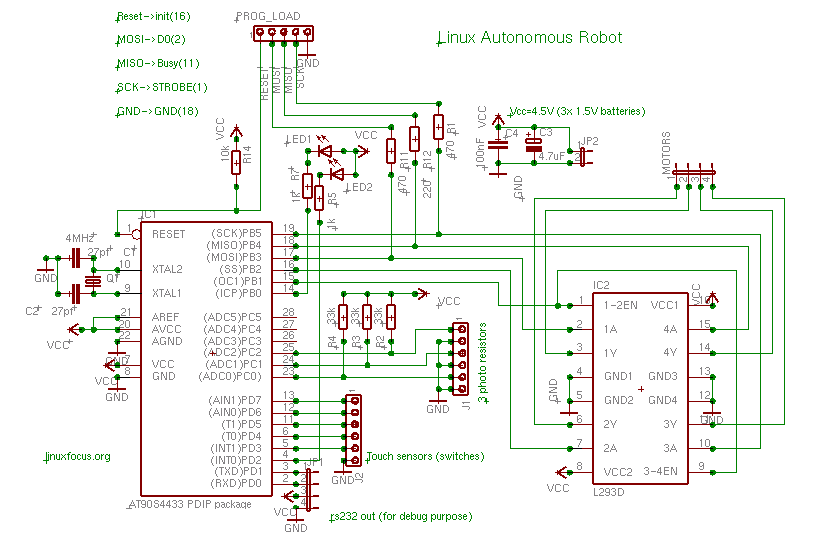 There are 3 different test programs included in the linuxrobot software package (download at the end of the article). The program ledtest causes the 2 LEDs to blink. You load it with the command "make ledtestload". This will compile the program and load it to the microcontroller. The 2 LEDs should start to blink immediately after the program was loaded. When this test is successful you can be sure that the microcontroller with its oscillator and the connection to the PC for loading software does work.